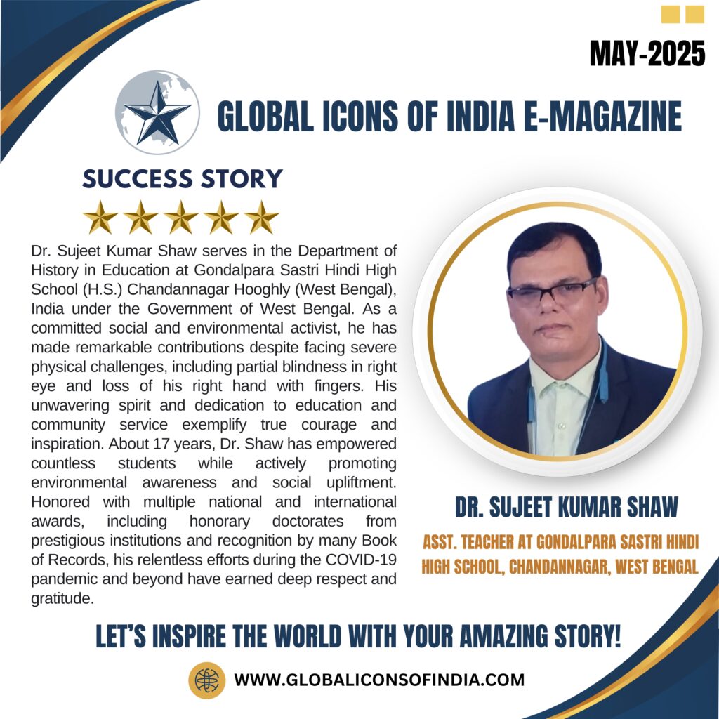 Serving in the Department of History in Education at Gondalpara Sastri Hindi High School (H.S.), under the Government of West Bengal, Dr. Shaw has consistently demonstrated an unwavering commitment to nurturing young minds and uplifting society. Despite facing severe physical challenges—including partial blindness in his right eys and the loss of his right hand with fingers—his resilience and dedication remain a beacon of hope and inspiration.