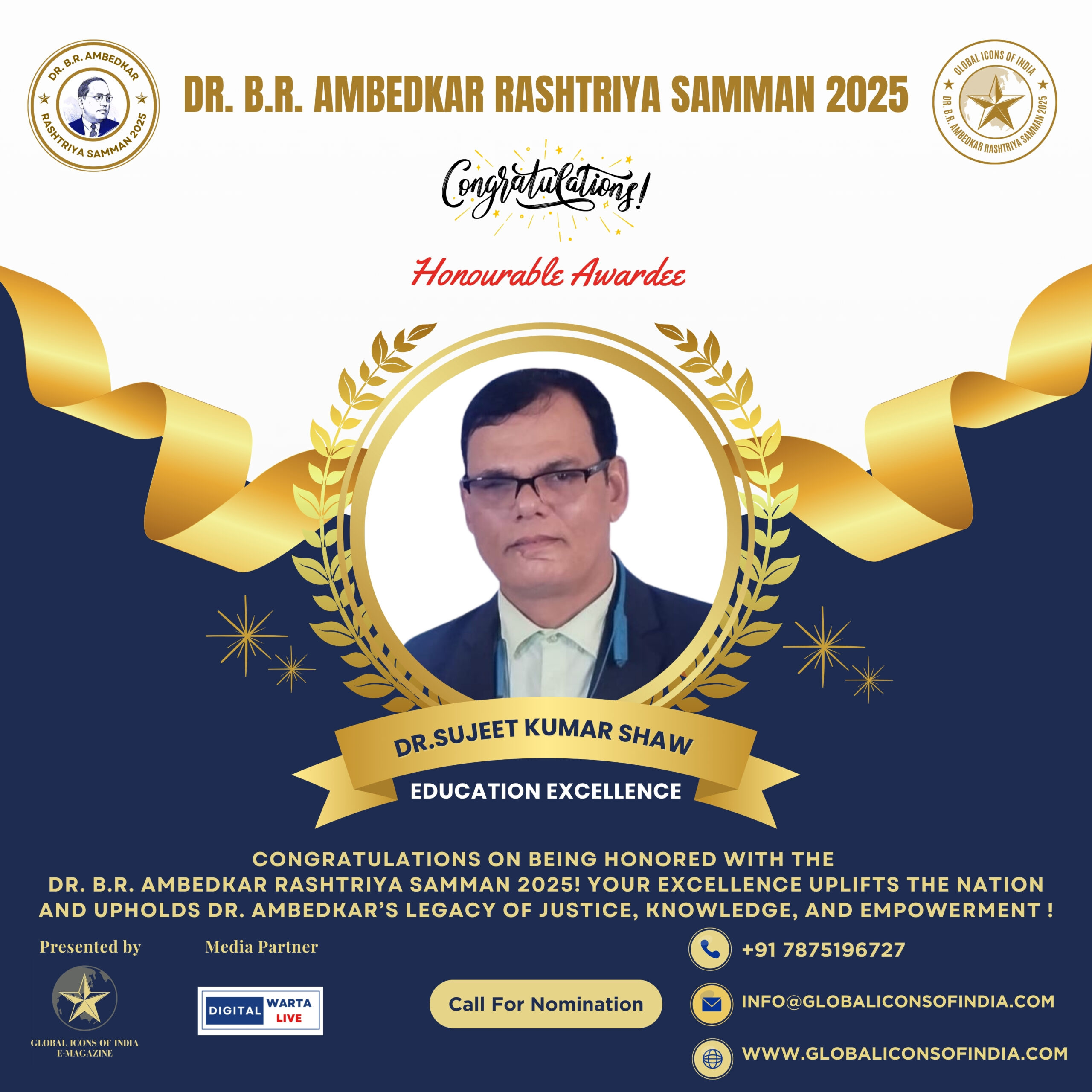 The Dr. B.R. Ambedkar Rashtriya Samman—awarded by Global Icons of Indiam E-Magazine and Media partner Digital Warta—celebrates individuals whose work reflects Babasaheb Ambedkar’s enduring values of justice, equality, and empowerment. Recipients receive a Certificate of Excellence, Medal of Honour, Trophy of Recognition, and a personalized digital poster to showcase their achievements nationally.
