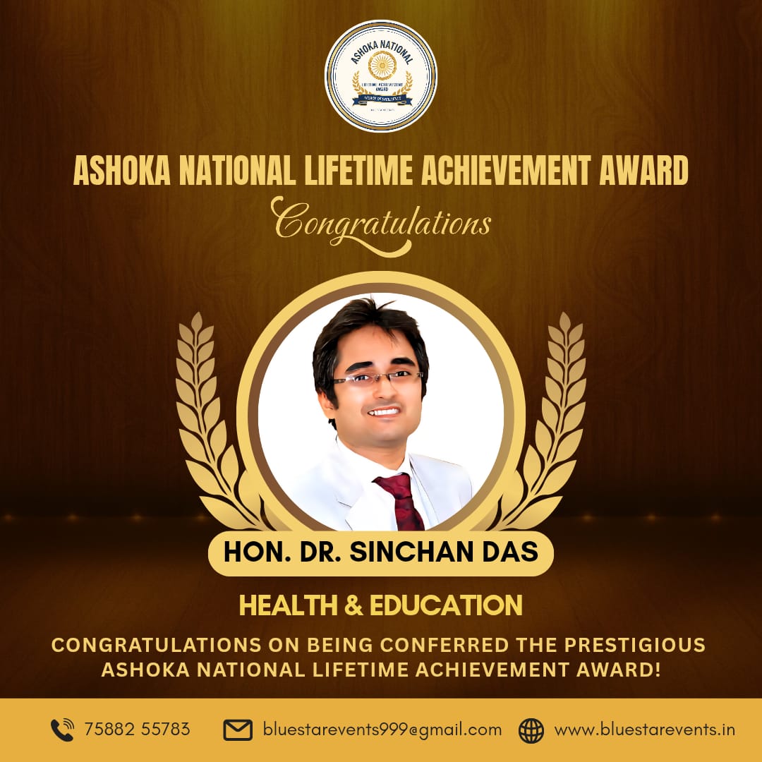 Kolkata-based Homoeopathic Psychiatrist, Dr. Sinchan Das, has been conferred the Ashoka National Lifetime Achievement Award in the Health & Education category, recognizing his 11 years of exemplary service and pioneering contributions in the field of Homoeopathic Psychiatry. This prestigious honor celebrates his unwavering commitment to advancing healthcare, education, and community well-being.