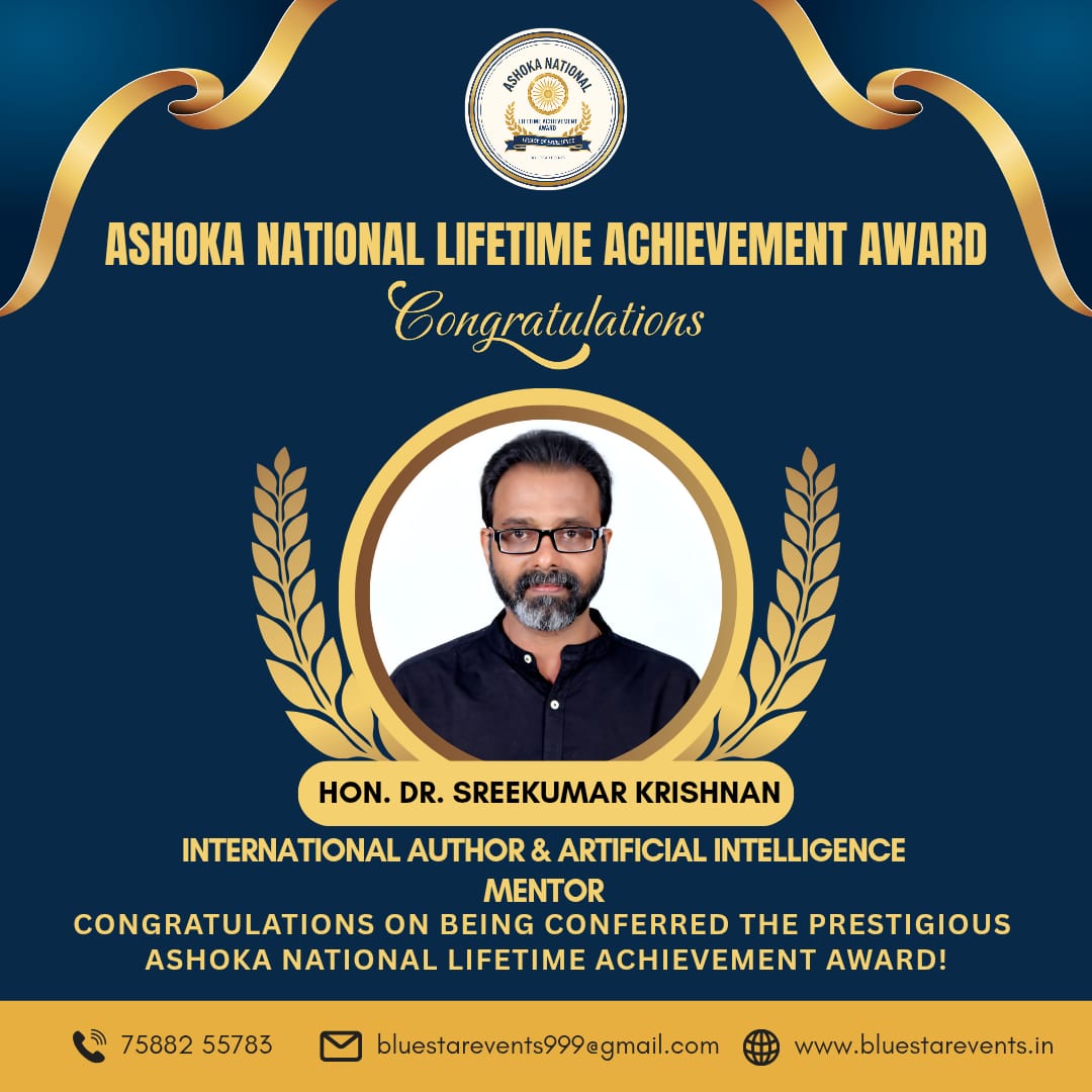 Kochi, Kerala – October 21, 2025: Dr. Sreekumar Krishnan, renowned International Author, Artificial Intelligence Mentor, and Strategic Business Consultant, has been conferred with the prestigious Ashoka National Lifetime Achievement Award for his exceptional contributions to Artificial Intelligence, Strategic Business Transformation, and Industrial Innovation on a global scale.