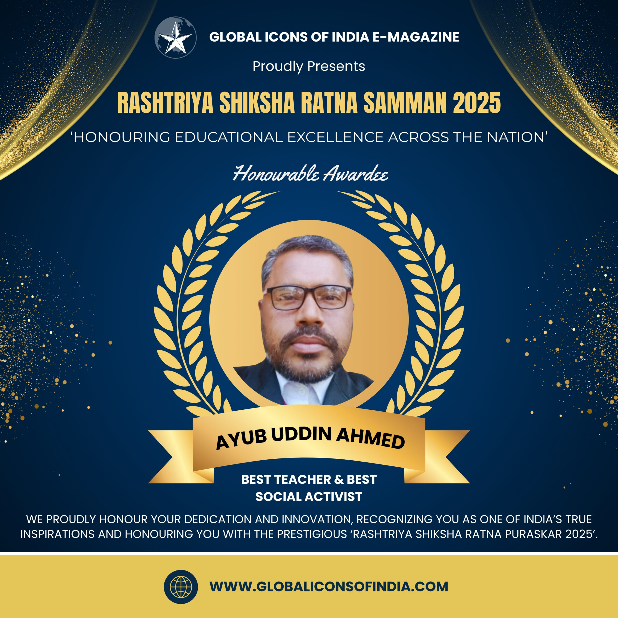 In a proud moment for Assam’s education sector, Ayub Uddin Ahmed, Head Teacher of 190 No. Bethbari LP School under Chirakuta Cluster, Chapar Education Block, Dhubri district, has been honoured with the prestigious Rashtriya Shiksha Ratna Samman 2025 by Global Icons of India e-Magazine.