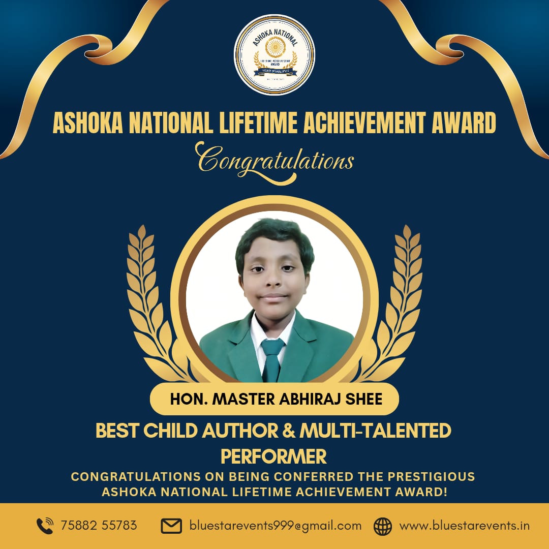 Kolkata 18 Dec.2025 : In a rare recognition of excellence achieved at an exceptionally young age, Abhiraj Shee, an 11-year-old student of Delhi Public School, Megacity, Kolkata, has been conferred the Ashoka National Lifetime Achievement Award by Blue Star Events, Nashik. The honour recognises his outstanding contributions as a child author, academic achiever and multi-talented performer, reflecting a journey marked by discipline, curiosity and creative brilliance.